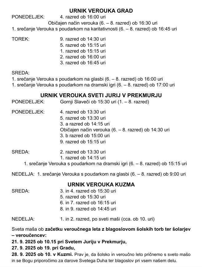 Prosimo za razumevanje, saj lahko še vedno pride do manjših sprememb dni in ur verouka za posamezne razrede in skupine. O tem boste pravočasno obveščeni s strani katehistinj ali voditeljev veroučnih skupin.
