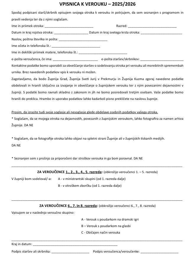 Verouk se bo začel v tednu med 8. in 14. septembrom v župnijah Grad, Sveti Jurij v Prekmurju in Kuzma. K prvi uri verouka prinesete tudi vpisnico.