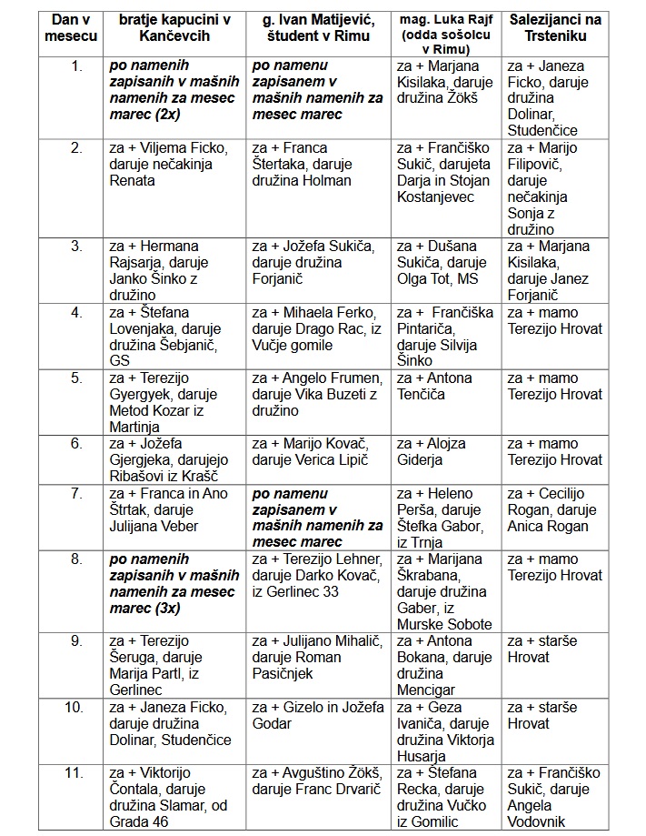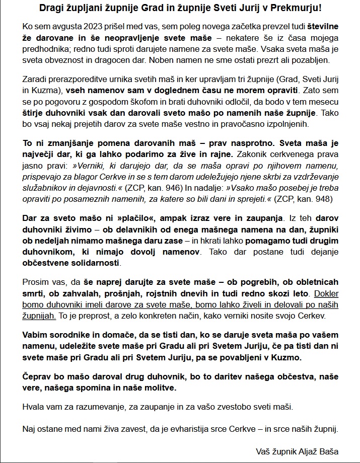 Zaradi velikega števila že darovanih in še neopravljenih svetih maš ter zaradi skrbi za tri župnije (Grad, Sveti Jurij, Kuzma) bodo v tem mesecu štirje duhovniki vsak dan darovali sveto mašo po namenih naših župnij. Tako bodo vsi prejeti darovi vestno in pravočasno izpolnjeni.