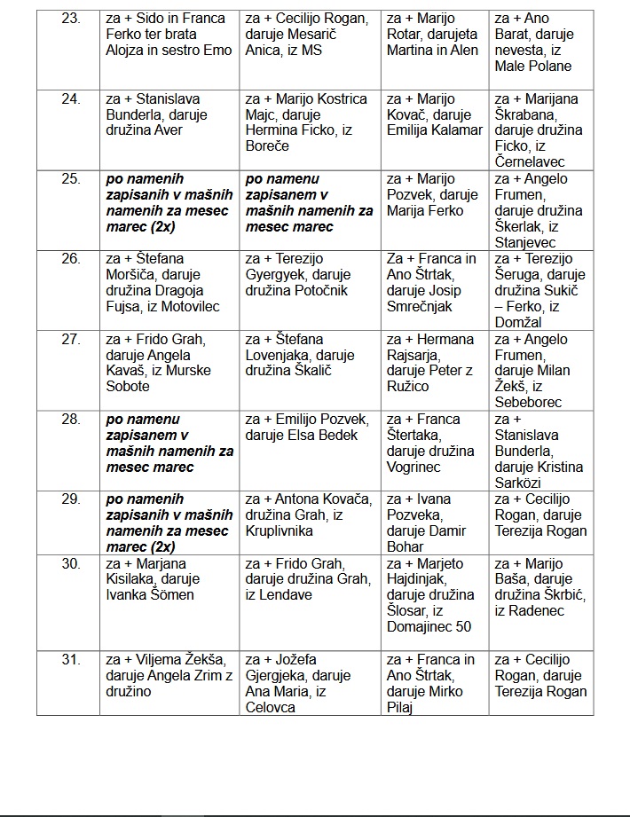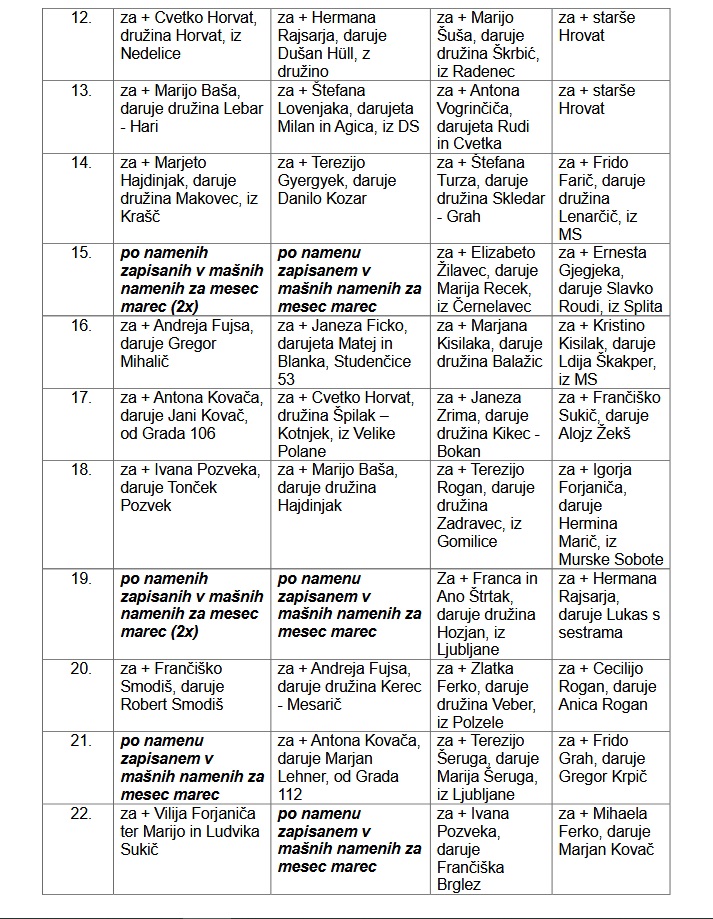 Sveta maša je največji dar za žive in rajne. Dar zanjo ni plačilo, ampak izraz vere, zaupanja in skrb za Cerkev ter duhovnike. Zato vas prosim, da še naprej darujete za svete maše ob pogrebih, obletnicah, zahvalah in prošnjah.